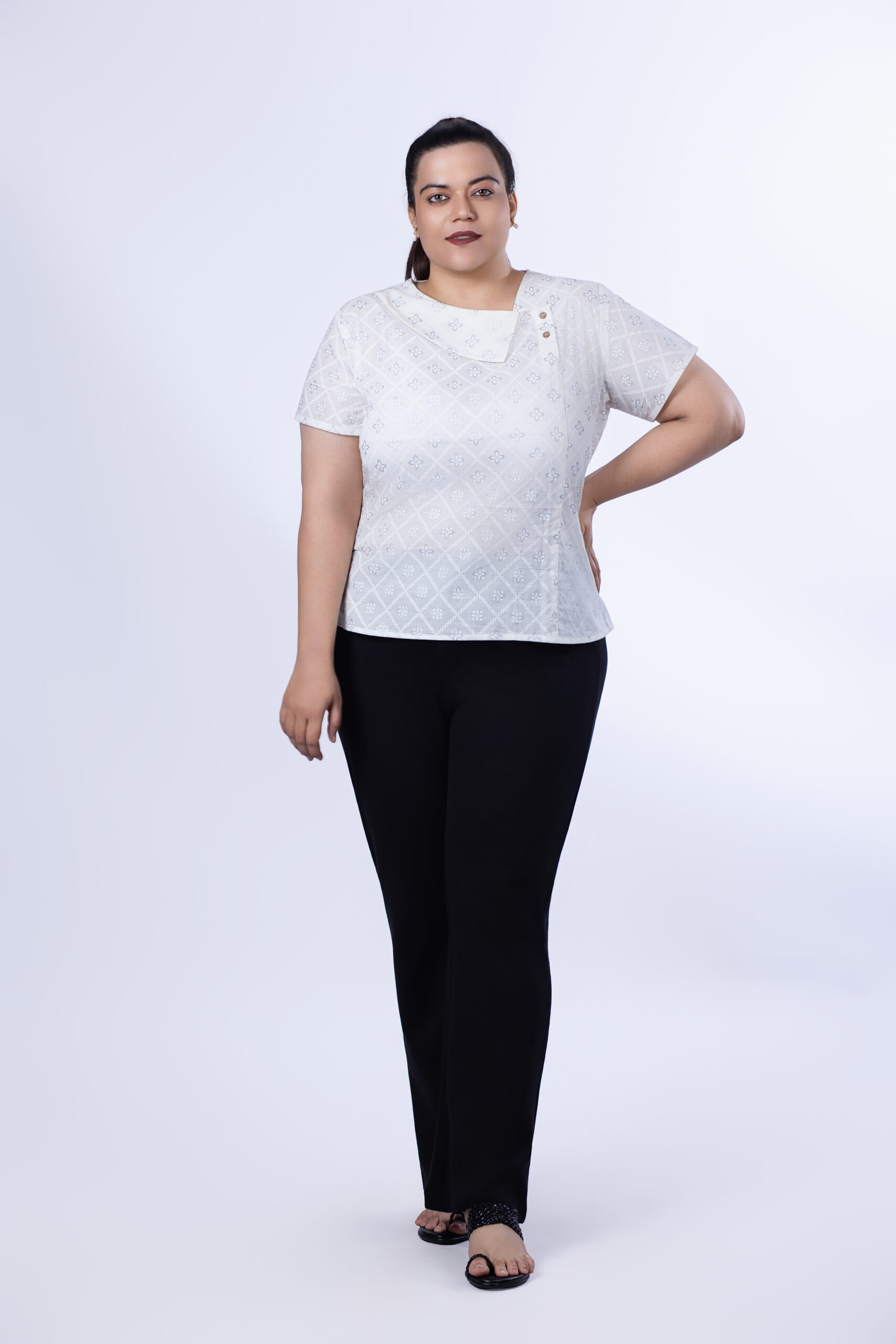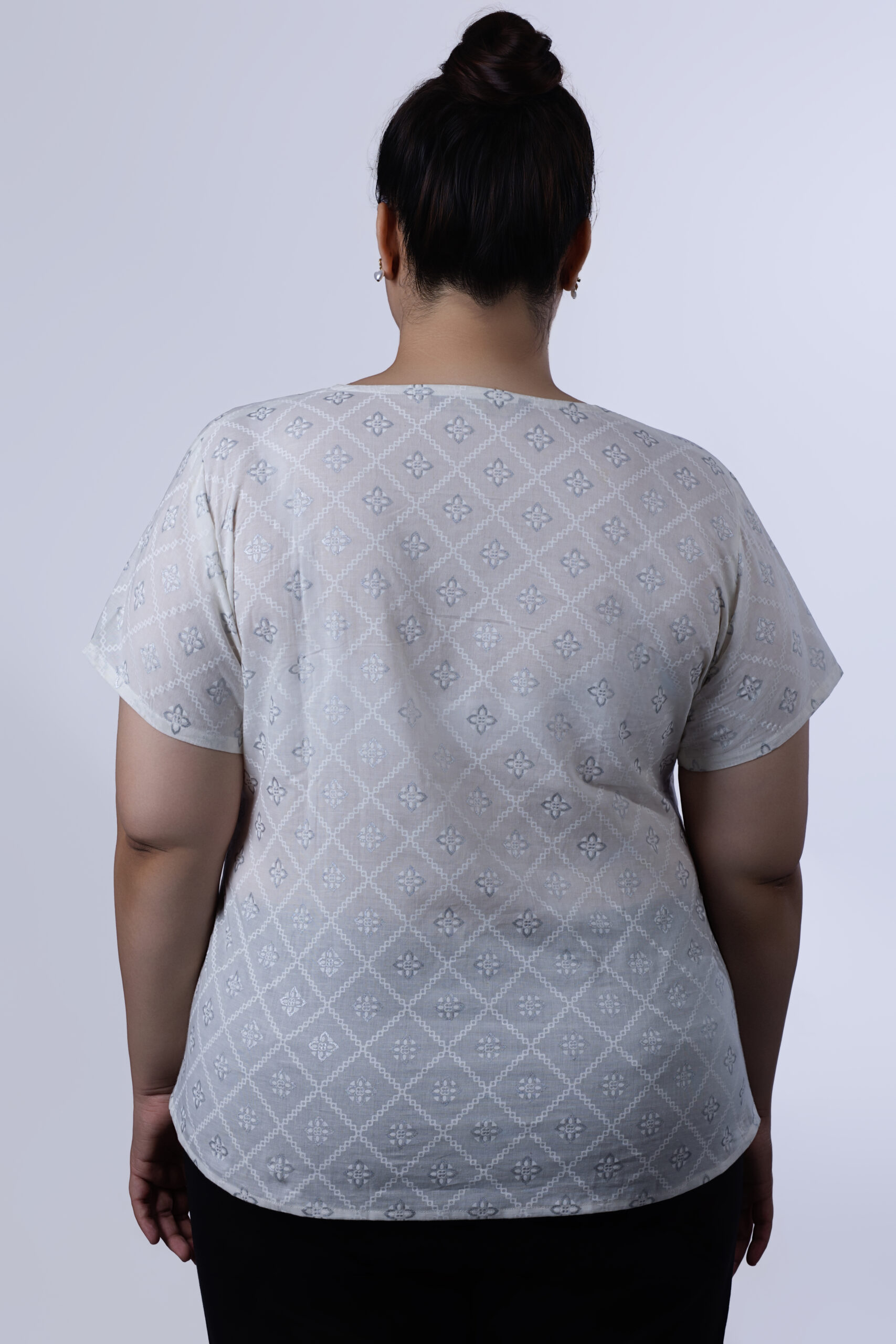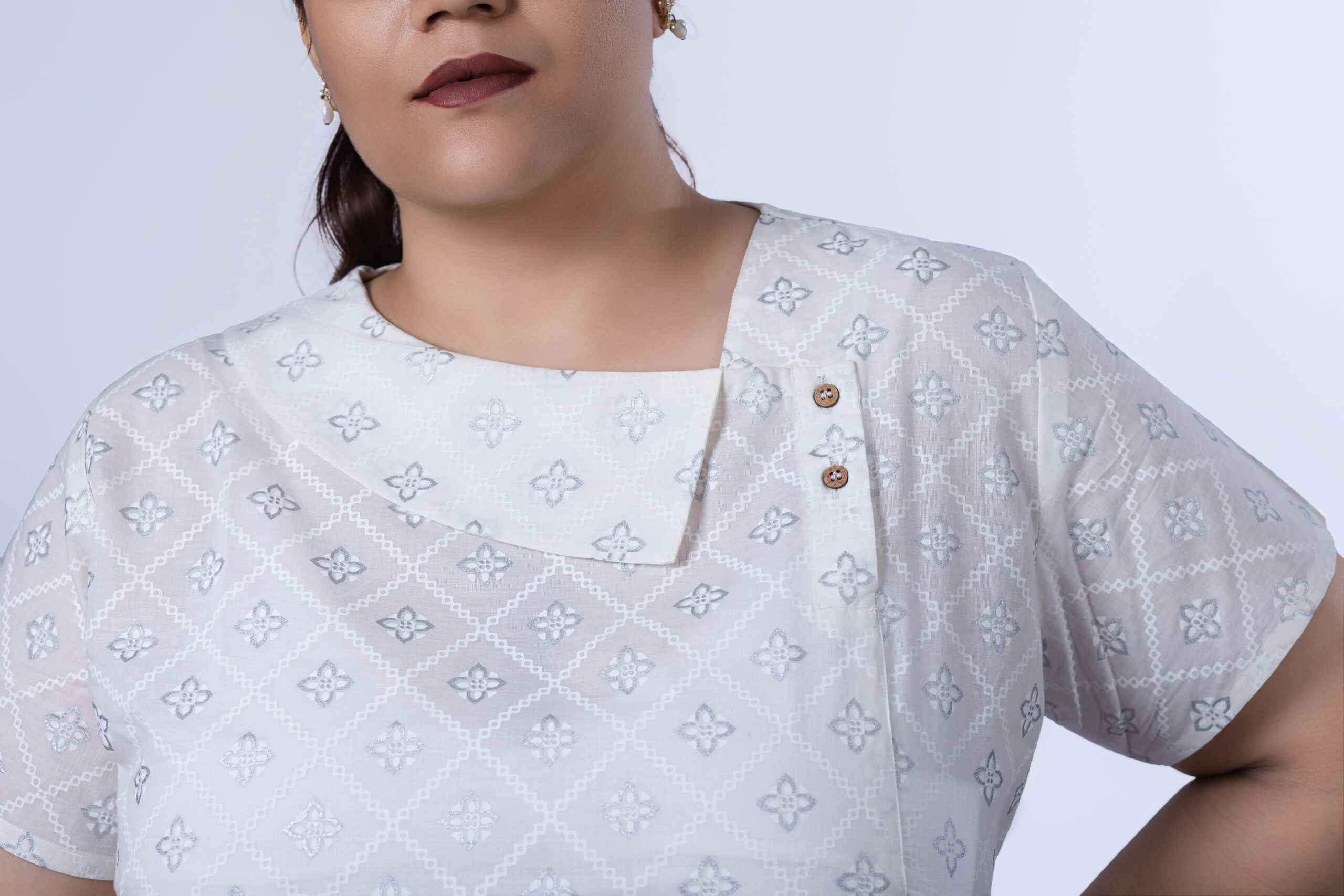 This exquisite top boasts a soft, off-white hue and is crafted from 60s khadi cotton, a material known for its durability and breathability. The refined single collar and elegant foil print add a touch of sophistication, making this top perfect for dressing up or keeping casual.