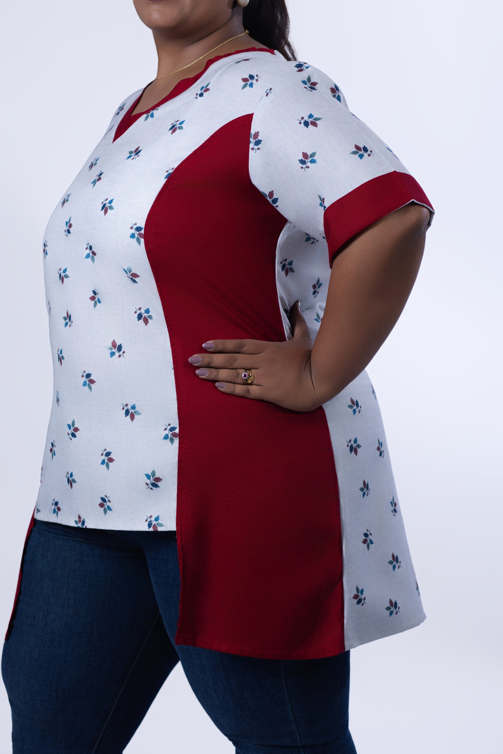 This Princess-cut top offers a unique and eye-catching design with its multicolor asymmetrical front panels, creating a visually striking look. The short mid-panel length hits at the hip, while the longer side panels hit at the upper thigh, adding a touch of femininity and sophistication to the overall design.