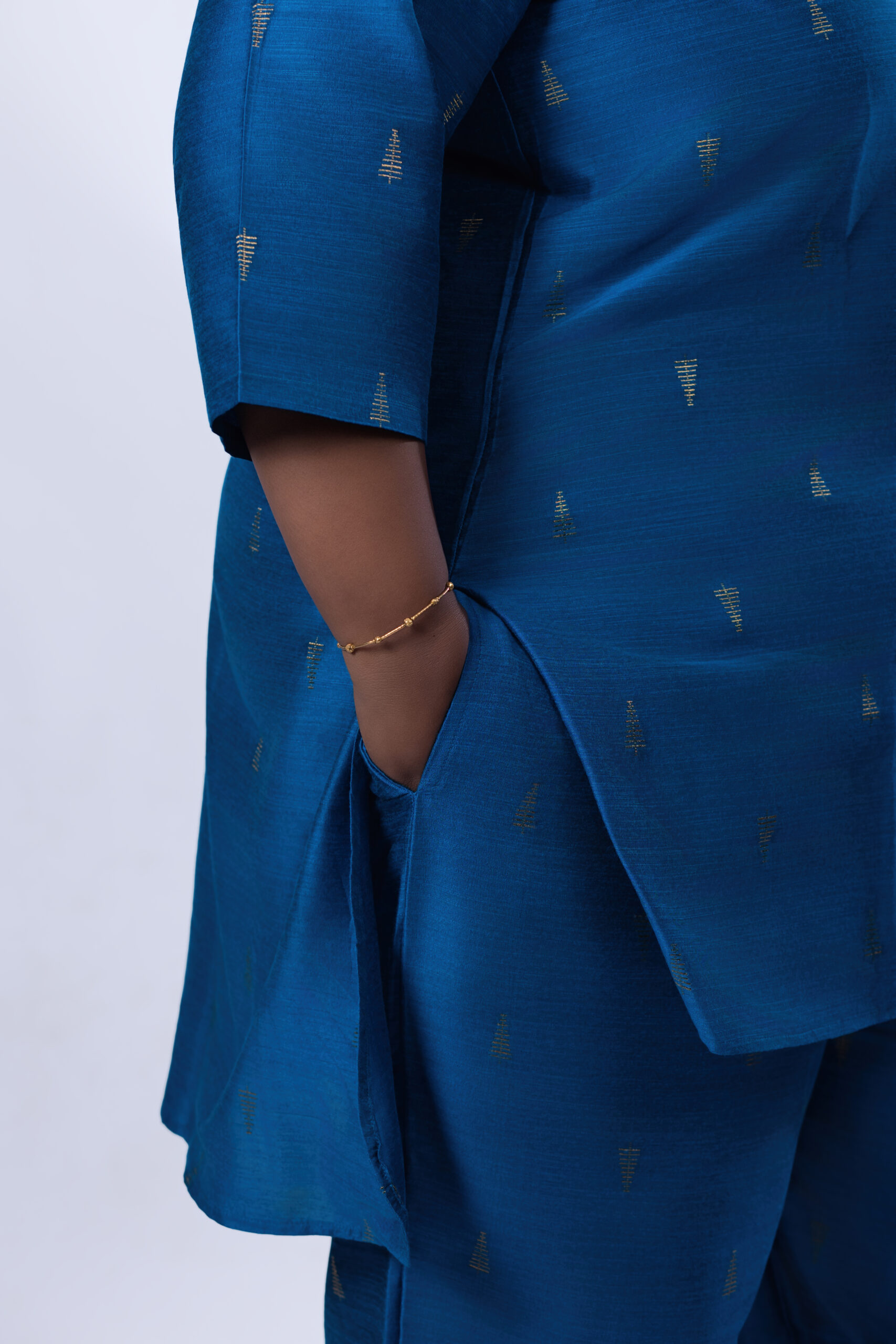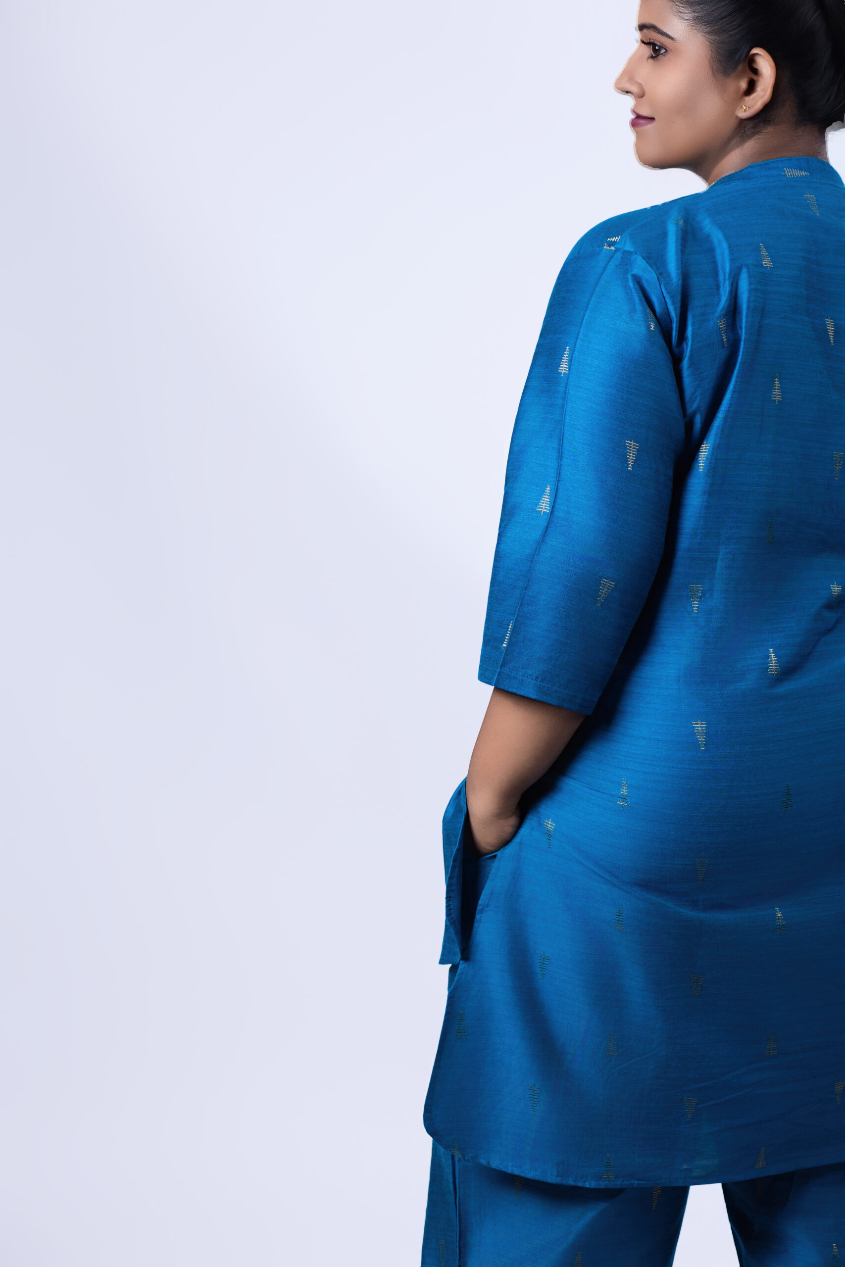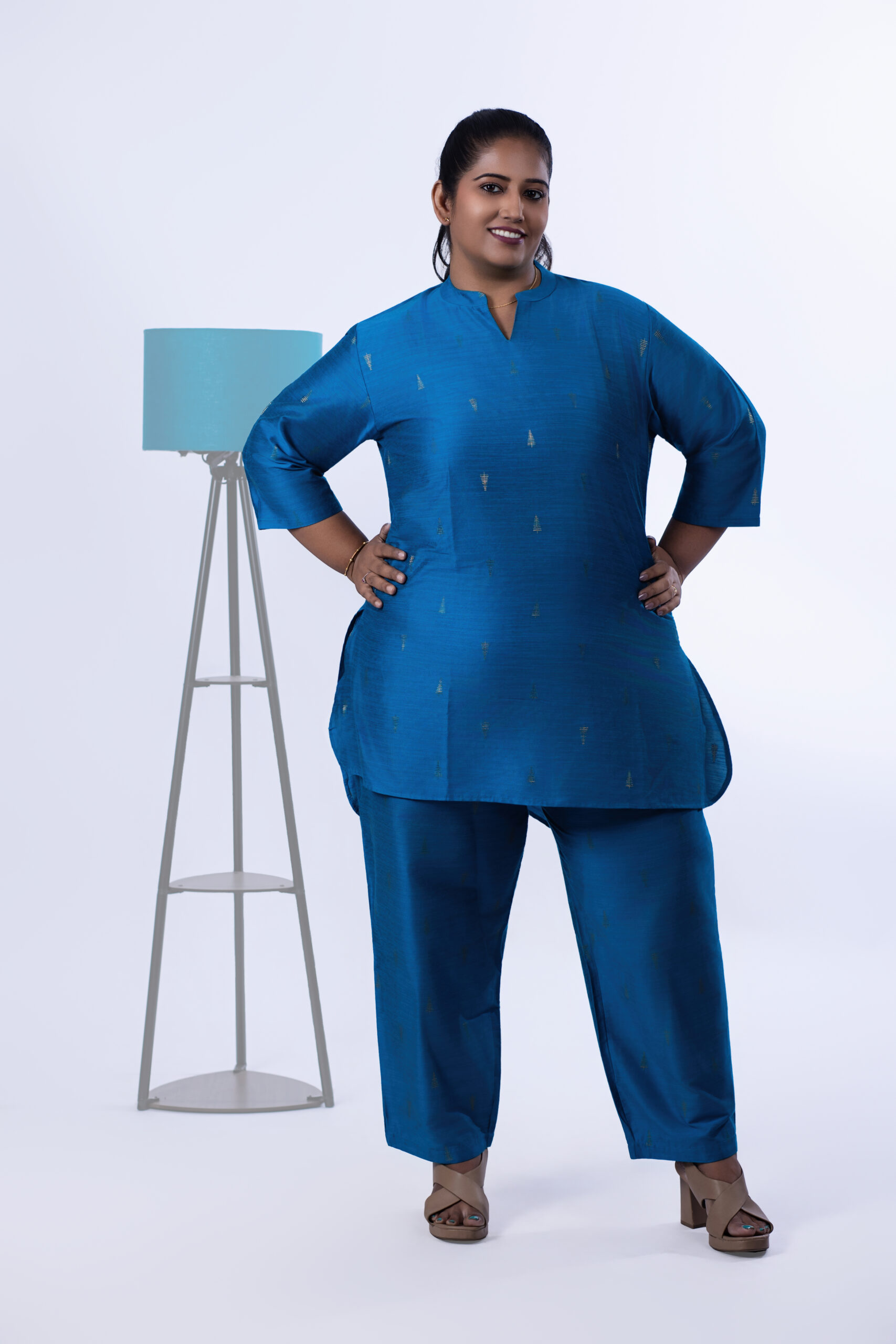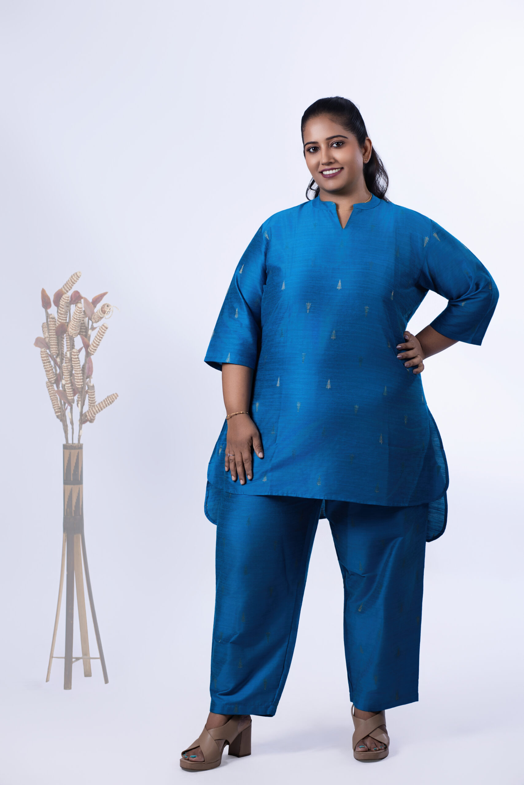 stylish co-ord set. This A-line semi-formal Kurti and Trouser set is suitable for all seasons. The
